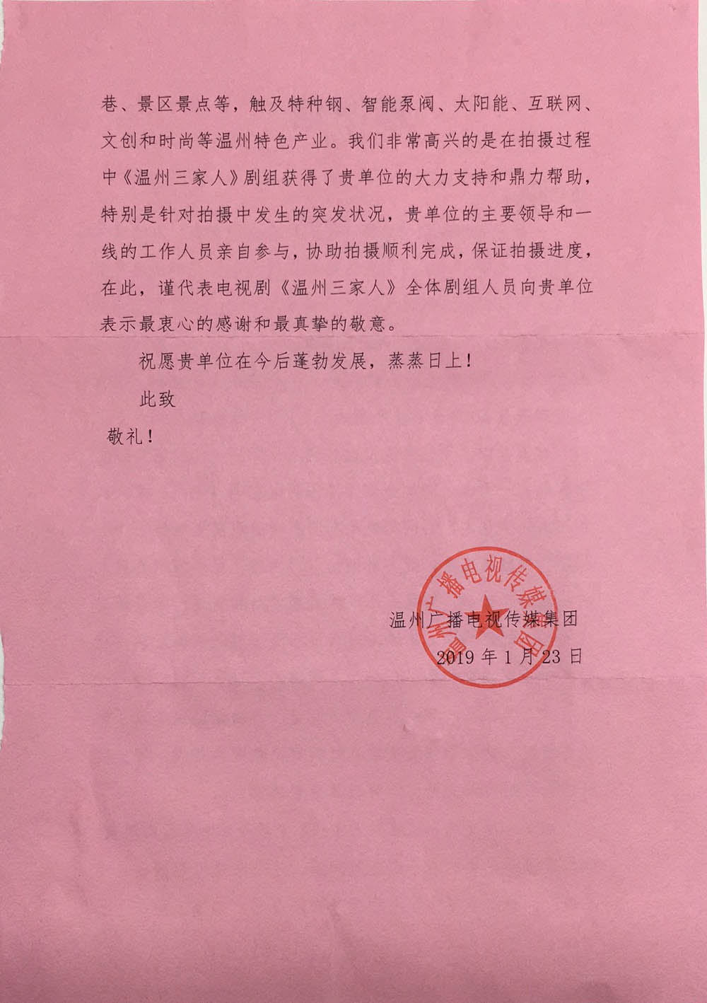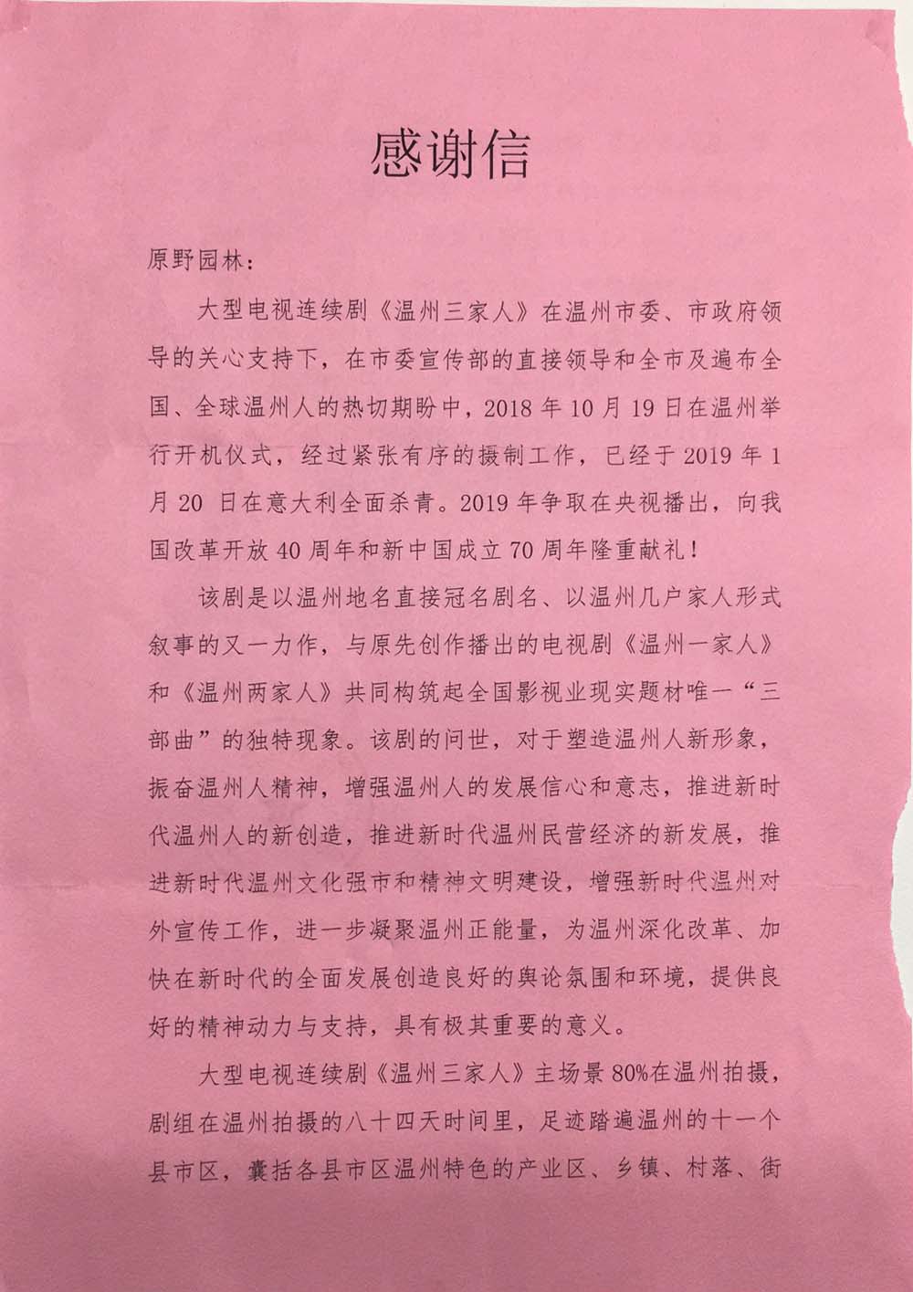 2019-02-012019年1月20日大型電視連續(xù)劇在意大利全面殺青。該劇于2018年10月19日在溫州舉行開機(jī)儀式,計劃2019年在央視播出,向我國改革開放40周年和新中國成立70周年隆重獻(xiàn)禮!劇中重要劇情在原野農(nóng)莊拍攝。