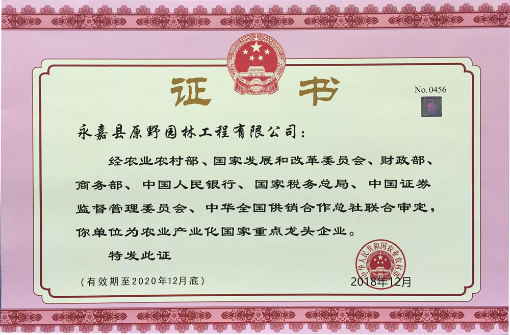 原野獲農(nóng)業(yè)產(chǎn)業(yè)化國(guó)家重點(diǎn)龍頭企業(yè)稱號(hào)