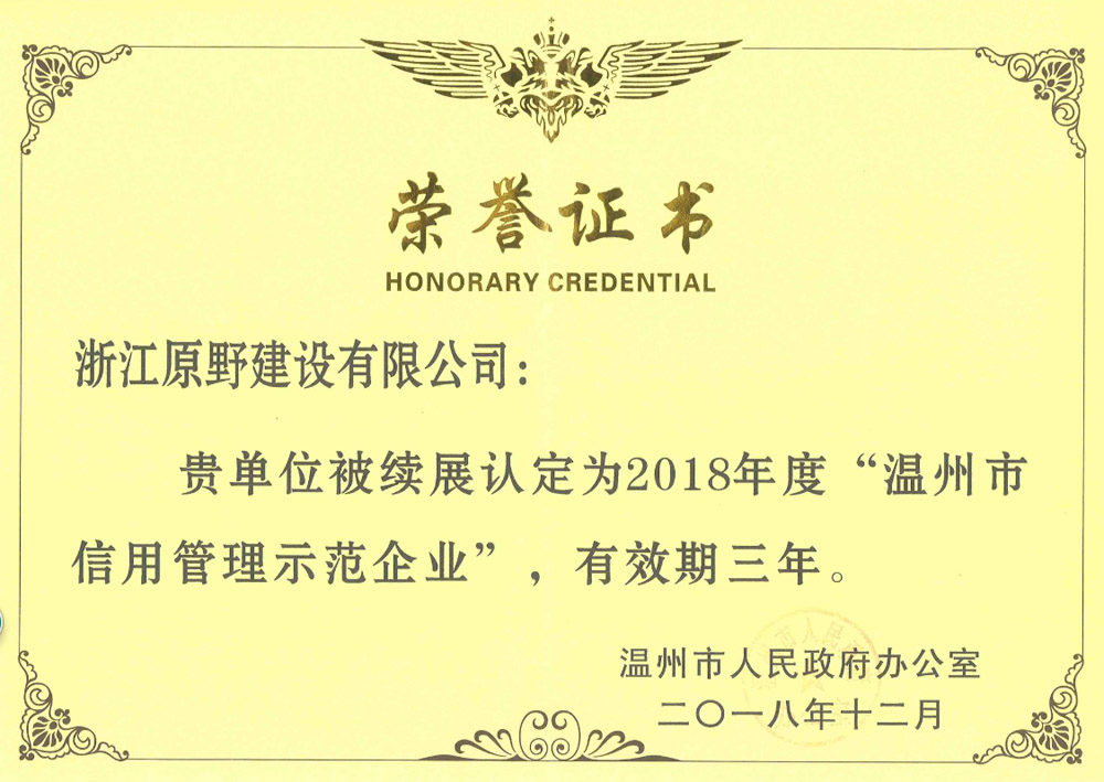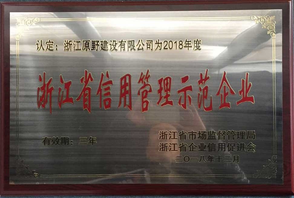 浙江省企業(yè)信用促進(jìn)會(huì)近日公布2018年度省級(jí)信用管理示范企業(yè)名單,其中浙江原野建設(shè)有限公司榮獲“浙江省信用管理示范企業(yè)”、“溫州市信用管理示范企業(yè)”兩項(xiàng)稱號(hào)。