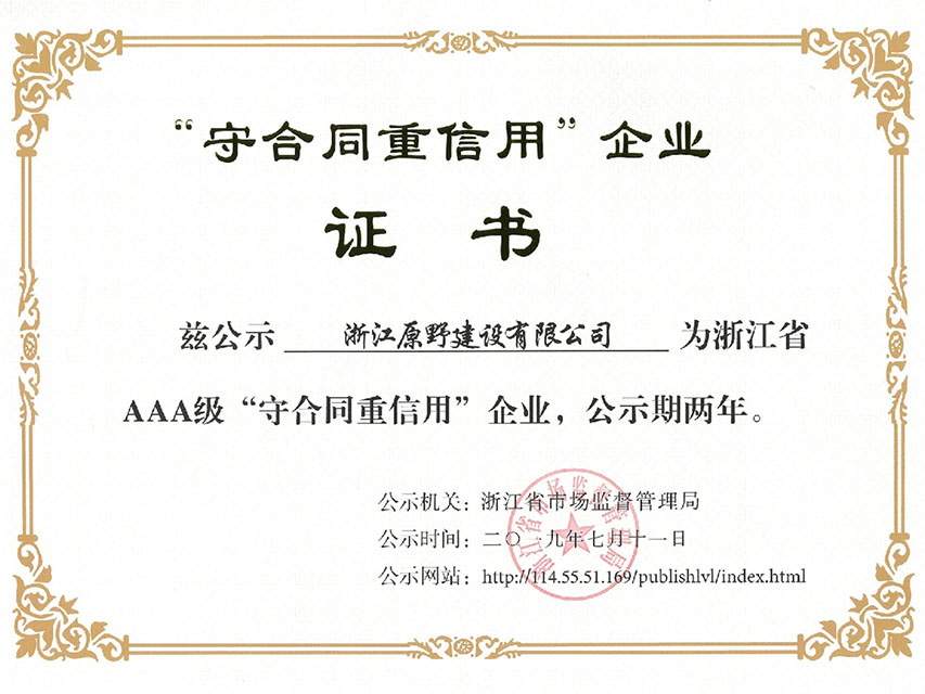 2019年8月,原野建設(shè)被浙江省市場(chǎng)監(jiān)督管理局授予浙江省AAA級(jí)“守合同重信用”企業(yè)稱號(hào),這是原野自2011年以來(lái)連續(xù)第四次獲得此項(xiàng)榮譽(yù)。